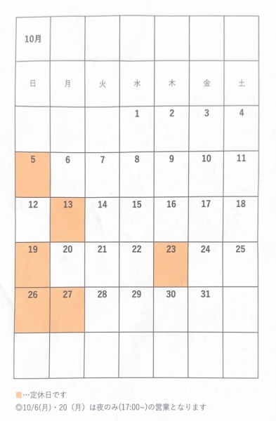 10月のお休みについて 2025-10-01 13:16:36 いつも、かき傳をご利用頂き誠にありがとうございます。10月のお休みについてお知らせ致します。10/13(月)は祝日の為お休みとなり、前日の日曜日が営業となります。また、6日と20日の月曜日は夜からの営業とはっております。皆様のご来店お待ちしております!