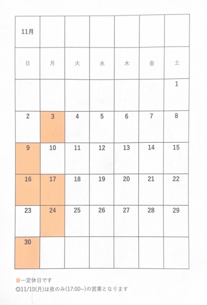 11月のお休みについて 2025-10-28 14:46:56 いつも、かき傳をご利用頂き誠にありがとうございます。11月のお休みについてお知らせ致します。11/3.24(月)は祝日の為お休みとなり、前日の日曜日が営業となります。また、10日の月曜日は夜からの営業とはっております。皆様のご来店お待ちしております!